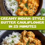 This 25 Minute Indian-Style Butter Cauliflower is a vibrant, flavorful vegetarian dish featuring cauliflower florets marinated in coconut milk and lime juice, then roasted until golden and crisp. Tossed in a rich, spiced butter sauce made with garam masala, curry powder, turmeric, and tomatoes, this recipe offers a creamy, comforting alternative to traditional butter chicken, perfect for a quick weeknight meal or plant-based dinner.