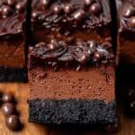 These decadent Chocolate Cheesecake Bars feature a rich Oreo crust topped with a creamy chocolate cheesecake filling and a smooth semi-sweet chocolate ganache. Perfectly baked until just set with a slight jiggle in the center, they are chilled overnight to develop deep flavor and a luscious texture, making them an indulgent dessert for chocolate lovers.