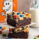 These Cookie Dough Brownies combine the rich, fudgy texture of classic brownies with a luscious, edible cookie dough topping studded with mini chocolate chips and M&M’s. This indulgent two-layer dessert perfectly balances brownie decadence with the fun and creamy cookie dough layer, making it an irresistible treat for any occasion.