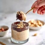 A clear glass cup holds a creamy light brown mousse as the bottom layer, topped with a thick, dark chocolate layer sprinkled with small chopped nuts. A woman's hand lifts a gold spoon from the cup, showing a scoop of both mousse and chocolate with nuts on top. Nearby, there is a small clear bowl filled with peanuts on a white marbled surface, and another gold spoon with a bit of mousse resting on the surface. photo taken with an iphone --ar 4:5 --v 7