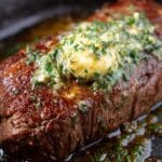 A close-up view of a cooked steak with a rich brown, slightly crispy outer layer, resting in a dark pan with some oil and herbs around. On top of the steak, there is a melted ball of light yellow herb butter mixed with green chopped herbs and small bits of mustard seeds, slightly oozing over the meat. The steak's texture looks juicy and tender with a glossy shine from the butter. The background is a white marbled texture. photo taken with an iphone --ar 4:5 --v 7