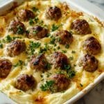 Keywords: meatball bake, mashed potato bake, comfort food, baked meatballs, cozy dinner, cheesy mashed potatoes