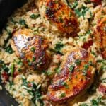 This Chicken Risotto recipe combines creamy arborio rice cooked slowly in chicken stock and white wine with juicy, seasoned chicken thighs for a hearty and flavorful meal. Sun-dried tomatoes and fresh spinach add vibrant flavor and nutrition, while Parmesan cheese and butter enrich the texture, making this one-pan dish a comforting and elegant choice for any dinner occasion.
