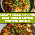 These Crispy Chile Ground Beef and Cauliflower Protein Bowls are a flavorful, nutrient-packed meal featuring spiced and crisped lean ground beef paired with tender cauliflower rice. Perfectly balanced with fresh vegetables and a tangy yogurt-lime drizzle, this recipe offers a delicious low-carb, high-protein dinner option that’s quick to prepare and full of vibrant Mexican-inspired flavors.