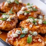 The image shows several pieces of chicken breast, each coated with a glossy, golden-brown sauce that looks sticky and shiny. On top of each chicken piece, there are small white chunks of cheese and fresh green leaves scattered evenly. The chicken rests in a shallow white dish with some sauce pooling around the edges. The background is a white marbled texture, and the focus is sharp on the chicken at the front, with the rest softly blurred. photo taken with an iphone --ar 4:5 --v 7