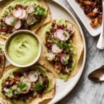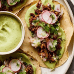- Assemble the tacos. Spread a generous swipe of avocado cream on each warmed tortilla. Top with the crispy tofu mixture, then garnish with minced red onion, thinly sliced radishes, and chopped cilantro.