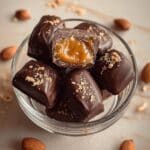 Keywords: Date Snickers, stuffed dates, peanut butter snack, chocolate dipped dates, healthy dessert, no bake treats