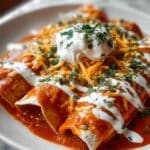 These Delicious Chicken Enchiladas combine tender shredded chicken cooked with onions, garlic, and warming spices, all wrapped in soft flour tortillas, smothered in zesty red enchilada sauce, and topped with melted Monterey Jack cheese. Baked to bubbly, golden perfection and served with fresh cilantro and sour cream, this classic Mexican-inspired dish offers a comforting and flavorful meal perfect for any occasion.