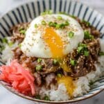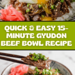 This Easy 15-minute Gyudon recipe brings a classic Japanese beef bowl to your table with minimal effort. Thinly sliced rib eye beef and tender onions simmered in a savory-sweet broth made from mirin, soy sauce, sake, and hondashi powder served over fluffy steamed rice and garnished with green onions, sesame seeds, pickled ginger, and a soft onsen tamago. Perfect for a comforting and quick weeknight meal.
