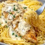 A large white plate holds a bed of thin yellow pasta topped with a creamy white sauce, speckled lightly with black pepper and green herb bits. On one side of the pasta is a single grilled chicken breast, golden brown with a creamy sauce coating and sprinkled with chopped green herbs. A silver fork twirls up a small bundle of the saucy pasta near the bottom right of the plate. The dish sits on a white marbled surface, showing a simple and tasty meal. photo taken with an iphone --ar 4:5 --v 7