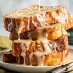 A stack of three thick slices of golden brown bread soaked in a glossy, creamy sauce that drips slowly down the sides, highlighting the moist texture of the bread. The crust is crisp and dark golden, while the inside looks soft and tender, with a shiny, smooth sauce coating each layer unevenly. The stack sits on a white plate with dark metal handles, placed on a soft olive-green cloth, all set against a white marbled texture background. Photo taken with an iphone --ar 4:5 --v 7