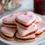 Keywords: heart-shaped cookies, strawberry shortbread, strawberry jam cookies, Valentine’s Day cookies, shortbread sandwich cookies, strawberry glaze, easy cookie recipe