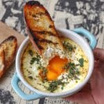 These baked eggs are best enjoyed fresh for the creamiest texture and runniest yolks. If you have leftovers, store them covered in the refrigerator for 3 to 4 days. To reheat, warm gently in the microwave for 1 to 2 minutes until heated through.