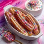 Delight in these festive Funfetti Churros, featuring a soft, warm interior with a crunchy fried dough exterior coated in colorful sugar and rainbow jimmies. Served with a creamy, sweet Funfetti Cream Cheese Frosting, these churros bring a playful and delicious twist to a classic treat—perfect for celebrations or a fun dessert any time.