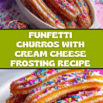 Funfetti churros offer a playful twist on the classic fried treat, featuring colorful sprinkles baked right into the dough. Paired with a creamy funfetti cream cheese frosting, these churros are soft inside, crunchy outside, and perfect for any festive occasion.