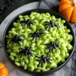 6. Serve and Decorate: Spoon the green mac and cheese into serving bowls and top with candy eyeballs and plastic spiders to create a creepy, fun Halloween monster effect.