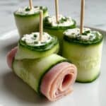 Ham & Cream Cheese Cucumber Rolls are a refreshing and healthy snack featuring thinly sliced cucumbers rolled with creamy herb-seasoned cream cheese and savory deli turkey. This quick and easy appetizer combines crisp cucumber, smooth cream cheese, and flavorful turkey, perfect for a light bite or party platter.