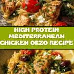 This High Protein Mediterranean Chicken Orzo is a flavorful and nutritious one-pan dish featuring tender chicken breast, al dente orzo pasta, fresh vegetables, olives, and a tangy lemon-garlic sauce, finished with crumbled feta and fresh parsley for a vibrant Mediterranean-inspired meal.
