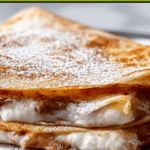 4. Cool and Slice Into Wedges: Transfer the cooked quesadilla to a cutting board and allow it to cool for 1 minute, letting the filling set slightly while remaining warm and gooey. Slice into triangular wedges using a sharp knife or pizza cutter. Optionally, dust with powdered sugar for added sweetness and a beautiful presentation.
