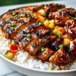 5. Step 5: Rest chicken for 3–5 minutes, then slice and serve over rice. Garnish with chopped green onions and add grilled pineapple slices if desired.