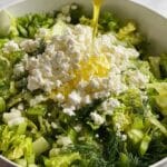 3. Combine and Toss: In a large mixing bowl, add the sliced romaine lettuce, diced scallions, chopped dill, and crumbled feta cheese. Pour the dressing over the salad, then toss everything together. Massage and scrunch the greens gently with your hands to help infuse the flavors and soften the texture.