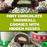 Keywords: mint chocolate cookies, snowball cookies, Hershey kiss cookies, chocolate mint dessert, holiday cookies
