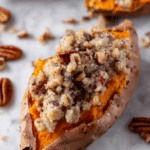 - Add Topping and Bake Again: Evenly sprinkle the pecan streusel topping over each filled sweet potato. Place them on a baking sheet and bake at 350°F (177°C) for 20-30 minutes, or until the topping is golden brown and crispy, and the filling is hot.