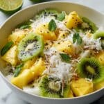 A refreshing and tropical Pineapple Kiwi Salad featuring juicy pineapple, sweet kiwis, zesty lime, and fresh mint, topped with toasted shredded coconut for a delightful crunch. This easy-to-make salad is perfect for a light snack or a vibrant side dish, ready in just 15 minutes.
