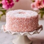 This Raspberry Swirl Snowball Cake is a delightful coconut-flavored dessert featuring a moist cake swirl with raspberry preserves, topped with stabilized whipped cream and shredded coconut for a snowy effect. Perfect for those who love a balance of sweet, fruity, and creamy textures.