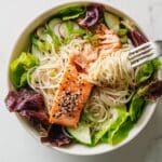 Sesame Salmon Noodle Bowls with Ponzu offer a delicious and light meal featuring tender baked salmon, chewy noodles, and crisp fresh vegetables. The toasted sesame seeds add a nutty crunch, while ponzu sauce brings a bright, tangy finish.