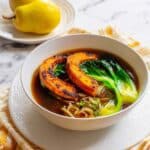 6. Serve: Ladle the hot broth with noodles and vegetables into wide bowls. Top each serving with the roasted kabocha squash slices and a drizzle of fragrant sesame oil for added depth and a nutty finish.