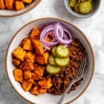 A white bowl with a thin brown rim shows two main layers: on the left, bright orange roasted sweet potato cubes with a slightly charred texture, and on the right, a rich, dark brown cooked ground meat mixture. On top, there are thin half-rings of purple-red onion and four overlapping green pickle slices placed slightly off center. A silver fork is resting in the meat layer on the right. Above the bowl, part of another similar bowl filled with roasted sweet potato cubes is visible. To the left, a small grey bowl contains extra green pickle slices. The background surface is a white marbled texture with a white cloth near the top right of the main bowl. photo taken with an iphone --ar 4:5 --v 7