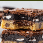 Keywords: Slutty Brownies, layered dessert, chocolate chip cookie base, Oreo brownies, fudgy brownies, easy brownies recipe