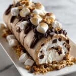 Keywords: s’mores ice cream roll, cookie dough dessert, no-bake dessert, campfire dessert, summer treat, frozen dessert, vanilla ice cream roll
