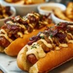 Two hot dog buns sit on a white marbled surface, each filled with a thick, golden-brown sausage as the base layer. On top of the sausages, there is a layer of crispy cooked bacon pieces with a dark, caramelized texture. Drizzled over the bacon is a smooth, creamy light beige sauce, spread evenly across the length of the hot dogs. Small green herb pieces are sprinkled on the sauce for a touch of color. The buns are soft with a light golden color and slightly shiny texture, gently hugging the fillings. In the blurred background, more food items are visible, served in white bowls. photo taken with an iphone --ar 4:5 --v 7