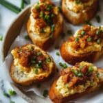 The image shows five small pieces of toasted bread each topped with three layers: the first layer is creamy and pale yellow, smooth with some specks of seasoning, the second layer is crispy, golden-brown fried bits scattered on top, and the third layer is small, fresh green onion slices sprinkled evenly over the dish. The bread has a crunchy, golden crust and a soft inside. All the pieces are arranged closely on white parchment paper, which lies inside a round, rough-textured dish. The scene is set on a white marbled surface. Some green onion pieces are scattered around the dish. photo taken with an iphone --ar 4:5 --v 7