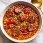 A hearty and flavorful Spicy Jambalaya Soup featuring smoky andouille sausage, tender chicken thighs, and a medley of aromatic vegetables simmered with Cajun spices, fire-roasted tomatoes, and long-grain rice for a comforting and satisfying meal.
