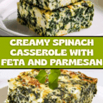A creamy and savory spinach casserole featuring a blend of cottage cheese, feta, and parmesan with fragrant spices, baked to perfection for a comforting and nutritious side dish or light main meal.