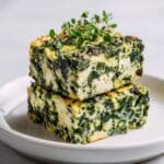- Mix Ingredients: In a large bowl, combine the beaten eggs, cottage cheese, thawed and drained spinach, crumbled feta, diced sweet onion, melted butter, grated Parmesan, black pepper, garlic powder, and a dash of nutmeg. Mix well until all ingredients are evenly incorporated.