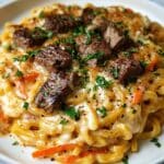 Store any leftovers in an airtight container in the refrigerator for up to 2 days. Reheat gently in a skillet over low heat to avoid overcooking the steak, or microwave in short bursts until warmed through. The pasta may absorb some sauce upon chilling, so you can add a splash of water or broth when reheating to loosen it up.