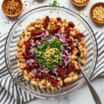 A vibrant and flavorful Sun Dried Tomato Cannellini Bean Salad that combines creamy beans with tangy sun-dried tomatoes, pine nuts, fresh basil, and a hint of garlic and red pepper flakes. This no-cook, easy-to-make salad is perfect as a light meal or a versatile side dish, great served on greens, wraps, or crackers.