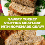 Turkey Stuffing Meatloaf combines the comforting flavors of traditional stuffing with lean ground turkey for a delicious twist on a classic meatloaf. This hearty dish is perfect for family dinners and comes with a rich homemade gravy and cranberry sauce for added flavor.
