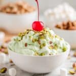 - Garnish and serve: Before serving, top the salad with additional Maraschino cherries and chopped pistachios for an attractive presentation and added crunch.